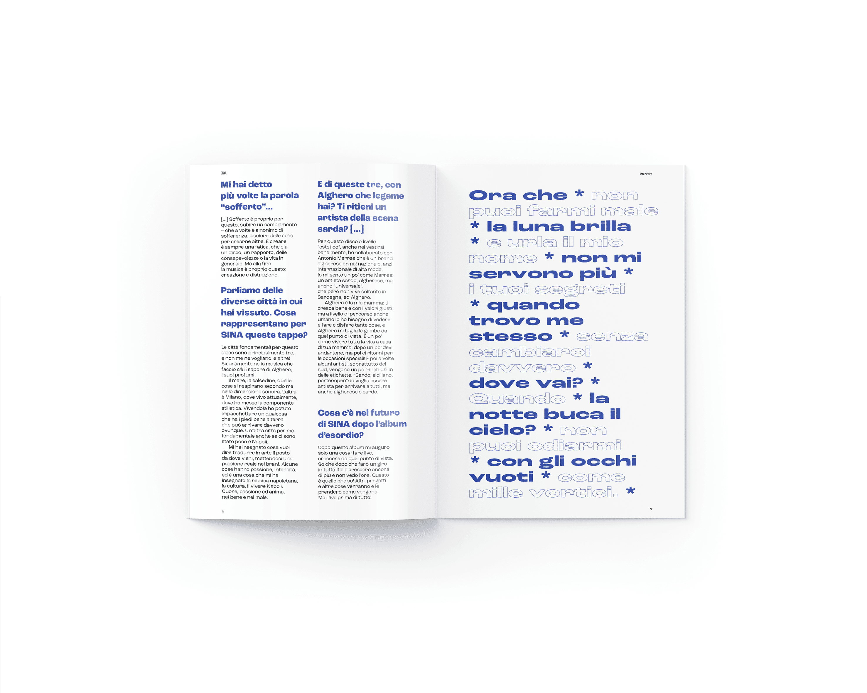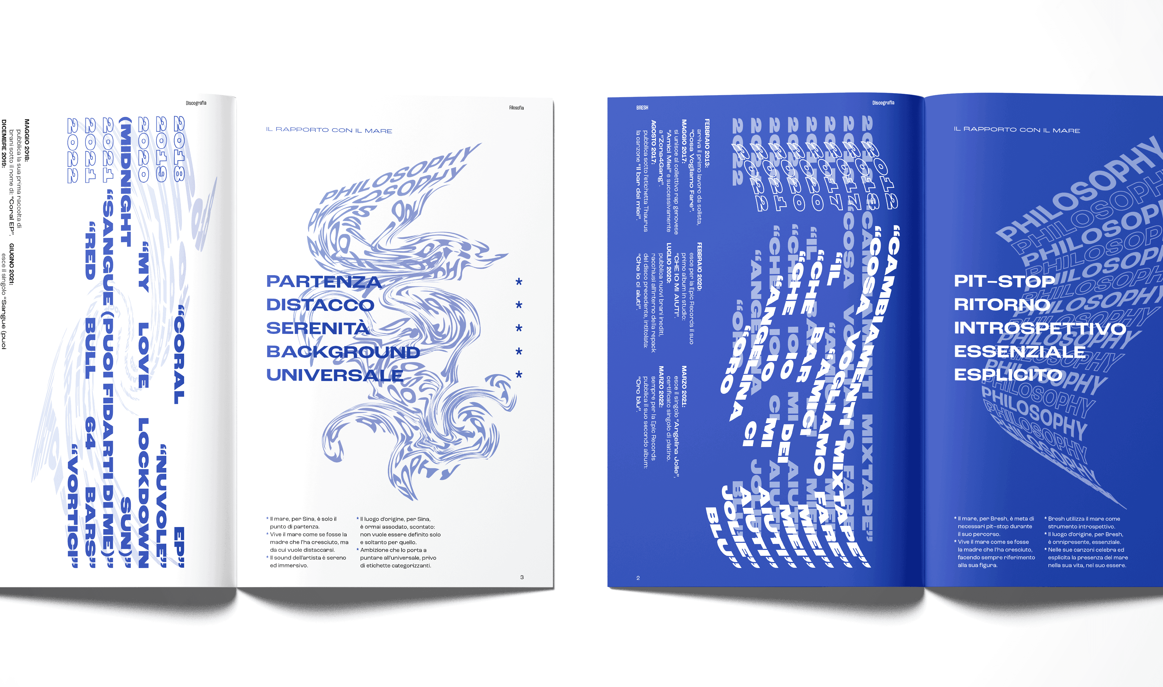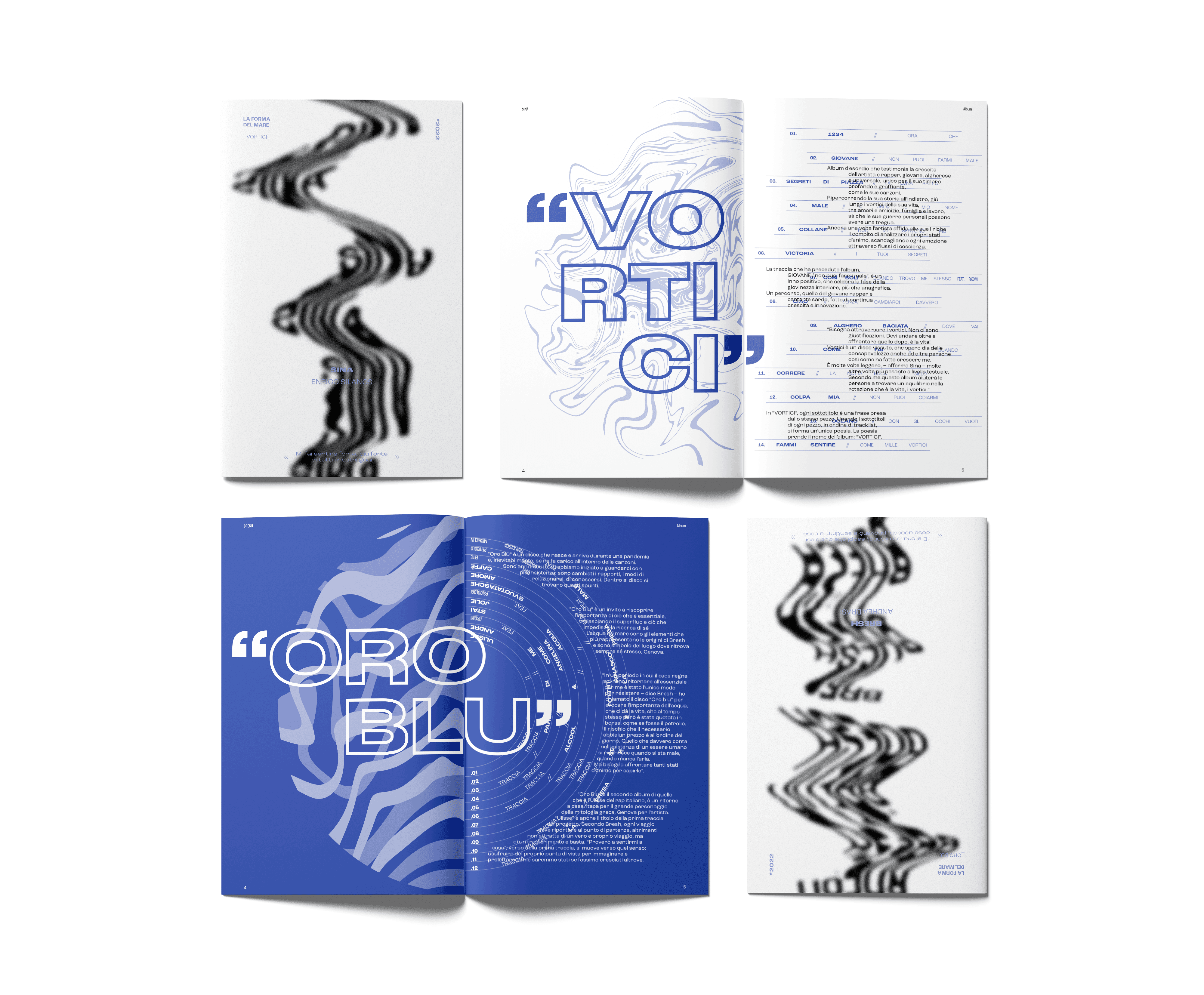The project was developed within an academic context, where students were asked to design a magazine using only one font. The chosen theme centers on the musical worlds of Sina and Bresh, two Italian artists whose works share a recurring motif: the sea.