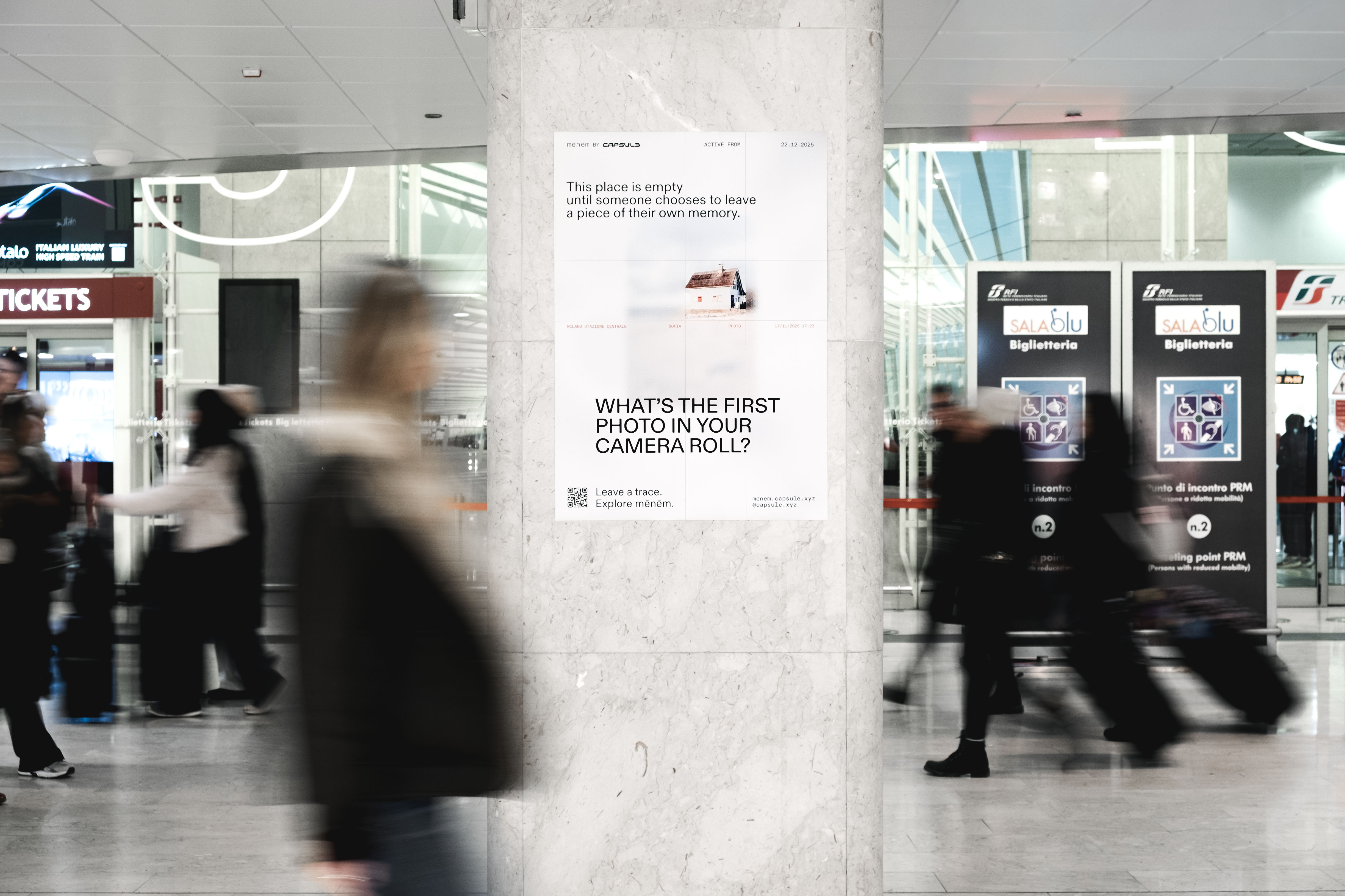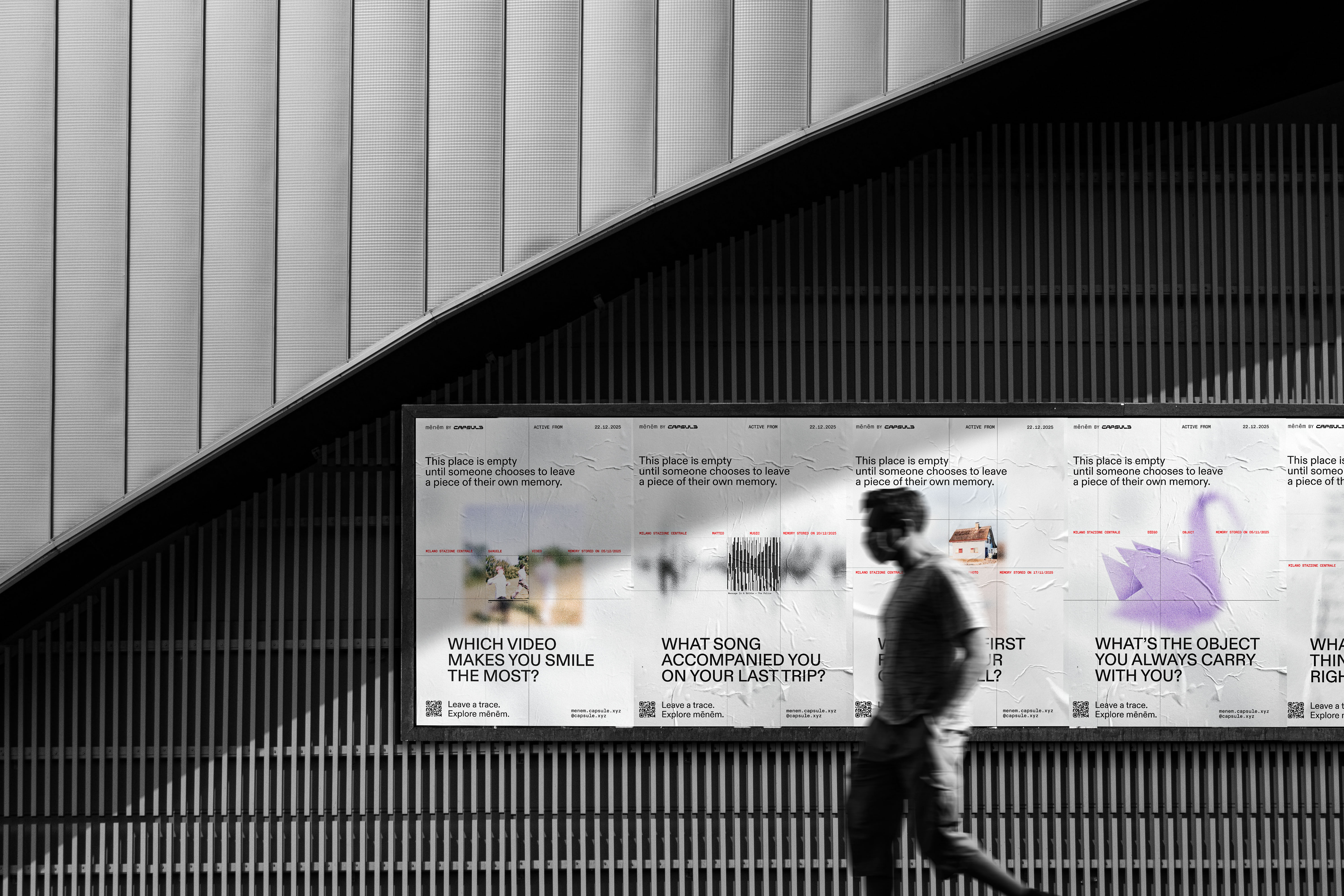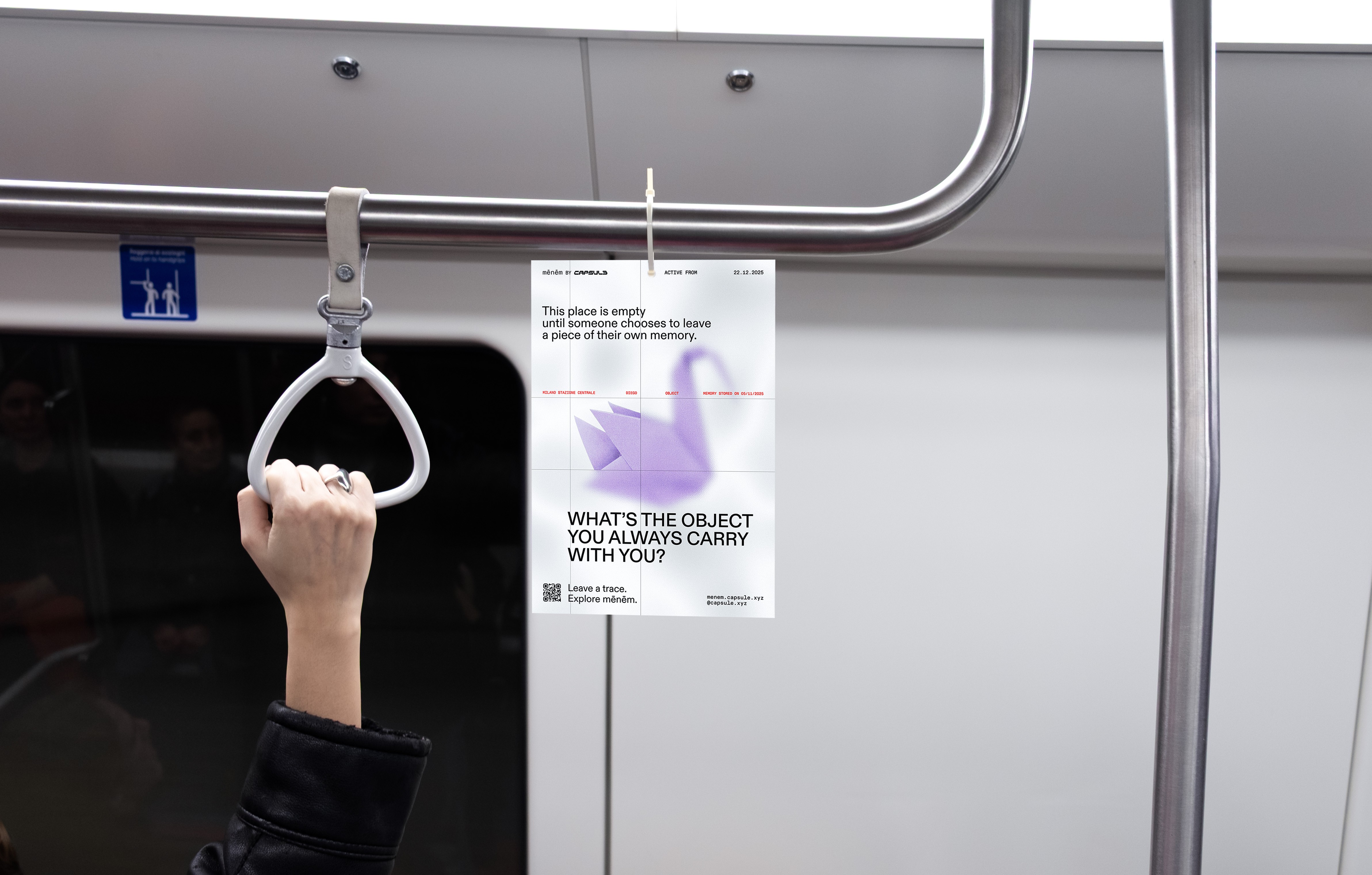 Capsule develops as a multidisciplinary collective investigating time and spaces of contemporary mobility. Grounded in listening-based research with Gen Z, the project addresses a form of mobility often perceived as utilitarian, anonymous, and emotionally empty. In response, Capsule reinterprets what Marc Augé defines as non-places, envisioning them as spaces capable of hosting memory and human connection. Through contextual analysis, Mēnēm